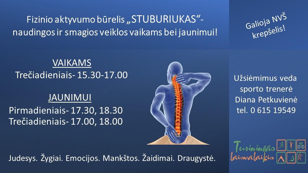 Kviečiame vaikus ir jaunimą į fizinio aktyvumo būrelį „Stuburiukas“, vykstantį Naujosios Vilnios kultūros centre! Šiame būrelyje vaikai lavins fizinį pasirengimą, gerins laikyseną ir stiprins kūną per įvairias aktyvias veiklas, žaidimus ir pratimų kompleksus. Užsiėmimams galioja NVŠ krepšelis. Prisijunkite ir aktyviai leiskite laiką su naujais draugais! |