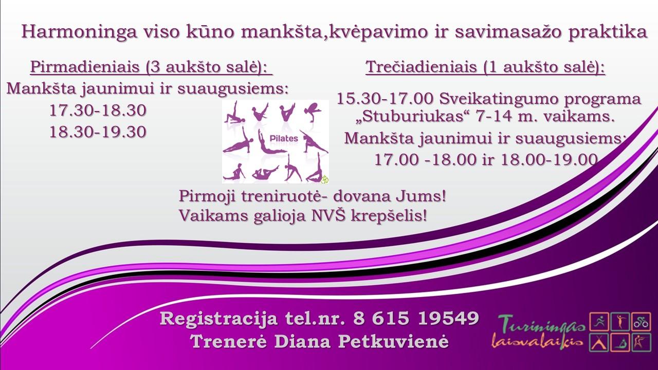 Kviečiame į Pilates mankštas, vykstančias Naujosios Vilnios kultūros centre! Užsiėmimai sujungia kvėpavimo technikas, savimasažo praktikas ir harmoningą viso kūno mankštą, padedančią sustiprinti kūną, pagerinti lankstumą ir sumažinti įtampą. Vaikams užsiėmimams galioja NVŠ krepšelis. Prisijunkite ir atraskite judesio džiaugsmą bei gerą savijautą! |