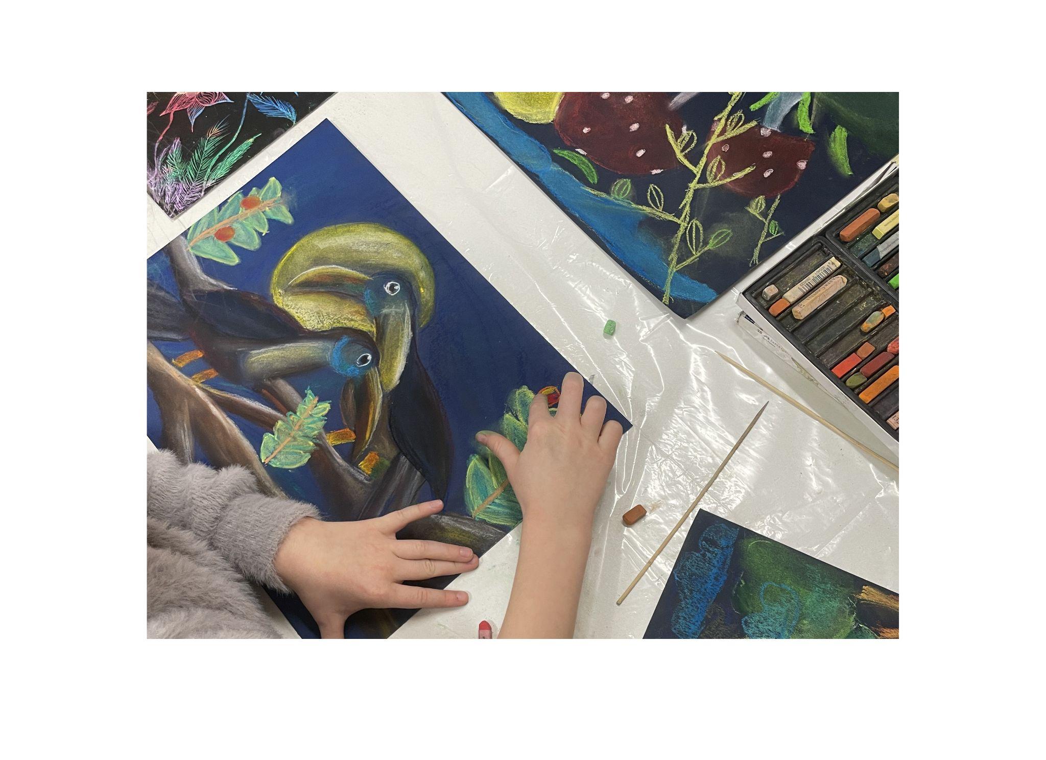 Piešimas ir įvairios dailės technikos, grupė 7–10 metų vaikams. Tai draugiška, jauki  ir kūrybiška aplinka  talentingam ir jautriam  vaikui. Profesionalios dailininkės Žimantės tikslas – suteikti moksleiviui žinių jo saviraiškai ir kūrybai.  Svarbu išlaisvinant ugdytinius kūrybiškam polėkiui, mokyti piešti, tapyti, kurti gratažus.  Piešiame paprastais ir spalvotais pieštukais. Dailininkė susipažindina  vaikus su akvarelės, tušo, piešimo plunksnele, gratažo, sausosios ir aliejinės pastelės technikomis. Įvaldę įviarias dailės technikas, mokiniais sukuria gražių, mielų darbelių ir piešinių, dalyvauja įvairiuose piešinių konkursuose.