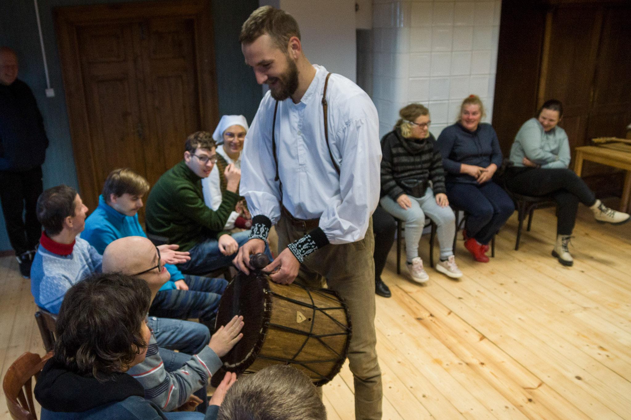Dalyviai turės galimybę patys išbandyti instrumentus: kartu sugroti sutartinę su skudučiais, pamušti bendrą ritmą būgnais ir patirti muzikos kūrybos džiaugsmą. Užsiėmimo pabaigoje visi edukacijos dalyviai išsirinks jiems patinkantį instrumentą ir sukurs bendrą improvizuotą kūrinį.
