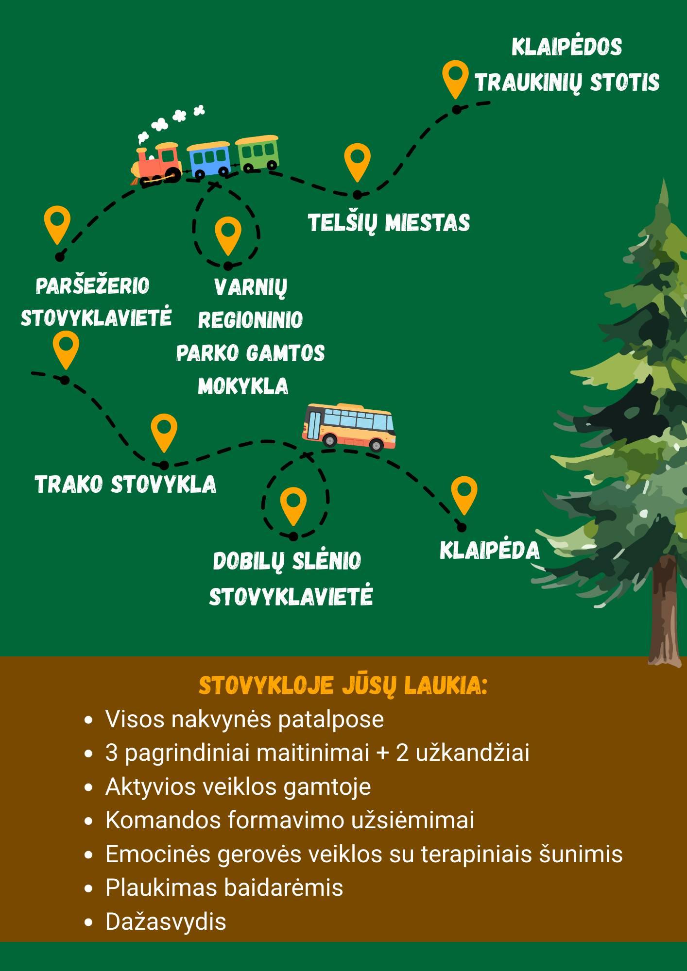 Kelionė prasideda Klaipėdos geležinkelio stotyje, iš kurios stovyklautojai traukiniu vyksta į Telšius. Čia jų laukia pažintis su miestu – ekskursija po įdomiausias vietas ir pirmieji bendri įspūdžiai. Vėliau kelionė tęsiasi į Varnių regioninį parką, kur gamtos apsuptyje prasideda tikrieji nuotykiai. Per kelias dienas vaikai pasiners į aktyvias, patyrimines veiklas: leisis į išgyvenimo žygius, tyrinės Bebrų taką, dalyvaus komandiniuose žaidimuose, mokysis bendradarbiauti ir spręsti iššūkius kartu. Vakare jų lauks jaukūs pokalbiai prie laužo, bendrystė ir galimybė atsipalaiduoti nuo kasdienio skubėjimo.