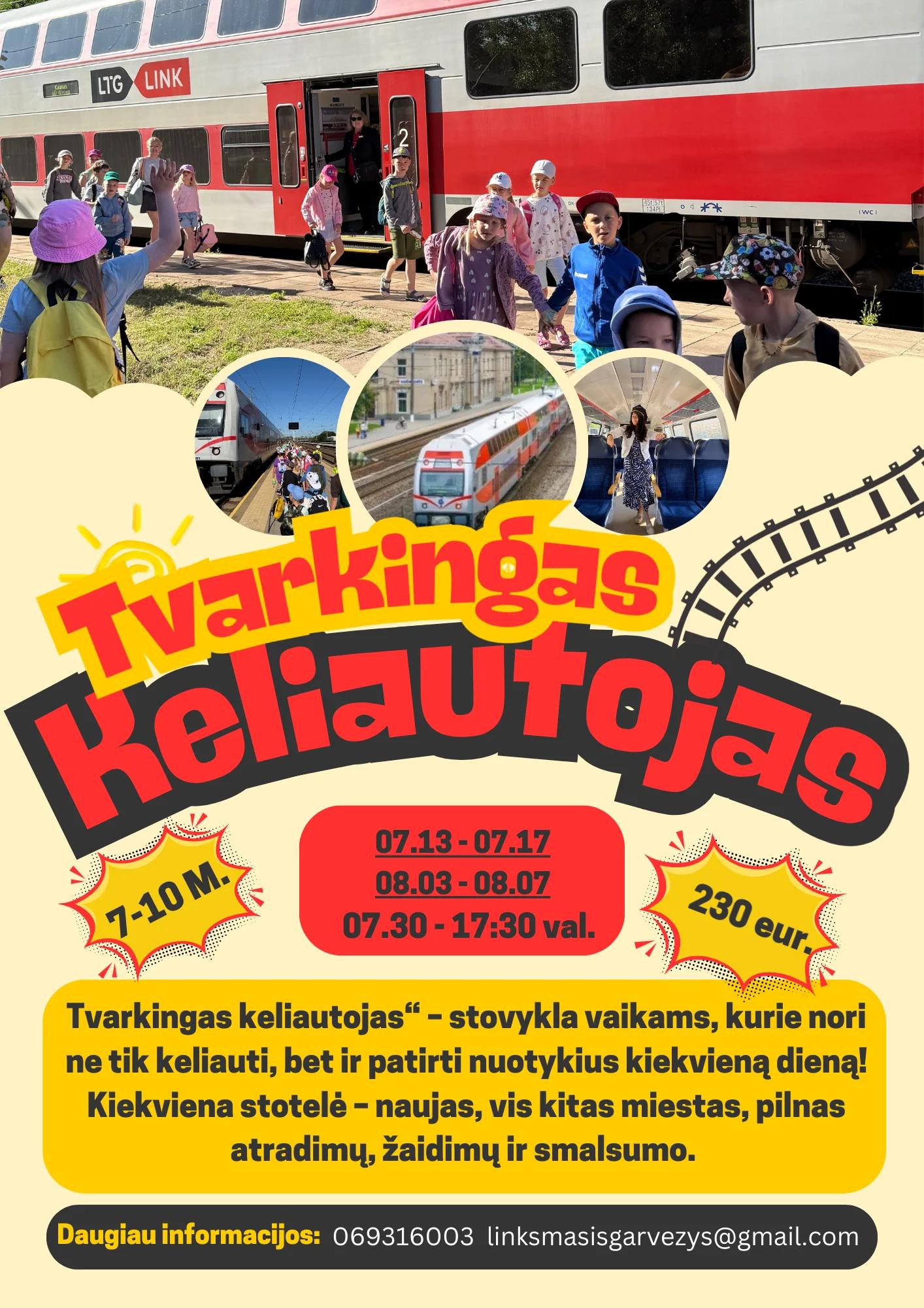 „Tvarkingas keliautojas“ – tai vasaros dienos stovykla, kviečianti vaikus leistis į kasdienius nuotykius, kuriuose susipina judėjimas, pažinimas ir smagūs atradimai. Tai savaitė, kur kiekviena diena prasideda kelione ir baigiasi naujais įspūdžiais. Stovyklos dalyviai kasdien keliaus traukiniu, patirdami tikrą keliautojo jausmą – stebėdami pro langą besikeičiančius vaizdus, mokydamiesi kelionės kultūros, tvarkos ir savarankiškumo. Kiekviena išvyka taps ne tik smagia pramoga, bet ir vertinga patirtimi, ugdančia atsakomybę bei pasitikėjimą savimi. Kelionės ves į įvairias įdomias vietas, kur vaikų lauks edukacijos, pažintinės veiklos ir aktyvūs užsiėmimai. Daug žingsnių, daug judesio ir dar daugiau nuotykių – nuo miesto tyrinėjimo iki netikėtų atradimų, kurie skatina smalsumą ir norą pažinti pasaulį. Stovykloje ypatingas dėmesys skiriamas ne tik patyrimams, bet ir kasdieniams įgūdžiams – tvarkingumui, atsakingam elgesiui kelionėse, gebėjimui pasirūpinti savo daiktais ir būti dėmesingu aplinkai bei kitiems. Visa tai vyksta lengvai, per žaidimą ir natūralų įsitraukimą. Tai vieta, kur vaikai ne tik keliauja, bet ir auga – mokosi būti savarankiški, drąsūs ir smalsūs pasaulio tyrinėtojai. Kviečiame prisijungti ir vaikus iš Kauno – pasitinkame stotyje ir kartu leidžiamės į šią patirčių kupiną savaitę.