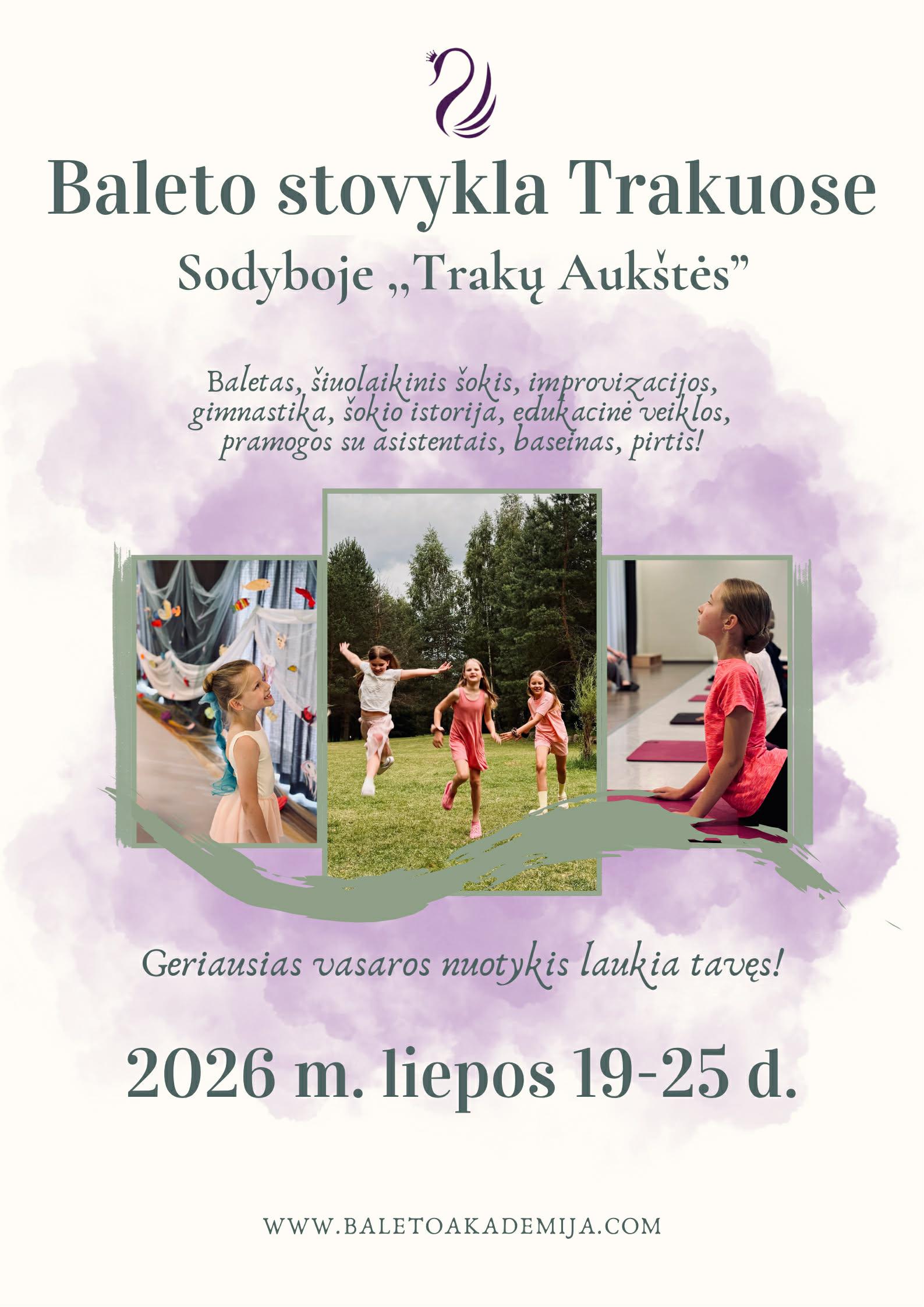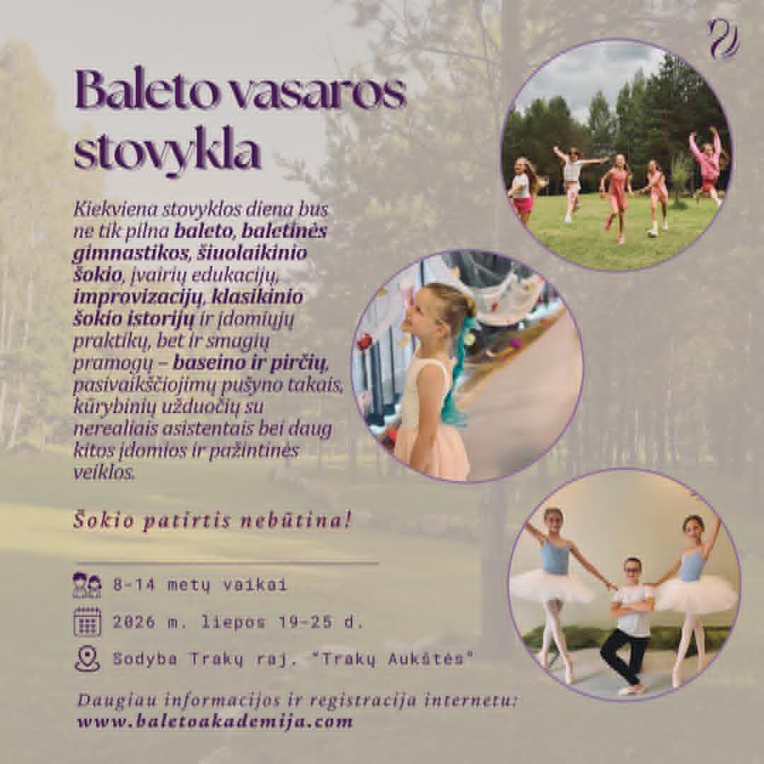 GERIAUSIAS METŲ NUOTYKIS LAUKIA! Neli Beliakaitės Baltijos baleto akademija patį vidurvasarį kviečia visus esamus ir būsimus baleto šokėjus ir nuo 8 iki 14 m. į pačią populiariausią laukiamiausią baleto stovyklą sodyboje "Trakų Auktės"! Tradicija, kuri puoselėjama jau septinti metai! Net septynios prasmingai ir smagiai praleistos dienos kartu! Kiekviena stovyklos diena bus ne tik pilna baleto, klasikinio šokio, baletinės gimnastikos, šiuolaikinio šokio, įvairių edukacijų, improvizacijų, klasikinio šokio istorijų ir įdomiųjų praktikų, bet ir smagių pramogų - baseino ir pirčių, pasivaikščiojimų pušyno takais, kūrybinių užduočių su šokio asistentais bei daug kitos įdomios ir pažintinės veiklos. Stovyklos mokytojai: Neli Beliakaitės Baltijos baleto akademijos pedagogai. Renkama tik viena stovyklos pamaina, todėl tikrai nedelskite, užsiregistruokite ir garantuokite sau vietą labiausiai pašėlusioje baleto stovykloje Lietuvoje. Į stovyklos kainą įskaičiuota: 6 kartų per dieną maitinimas (pusryčiai, priešpiečiai, pietūs, pavakariai, vakarienė, sveikieji naktipiečiai); įdomus laisvas laikas su mokytojais, asistentais; apgyvendinimas dviviečiuose - šešiaviečiuose kambariuose (pagal LRV ir SAM higienos rekomendacijas). Registracija internetu: https://www.baletoakademija.com/isvykstamoji-baleto-stovykla-traku-raj/?fbclid=IwY2xjawRdhjtleHRuA2FlbQIxMABicmlkETBQbllOaDB4c2pwZkoxVGxTc3J0YwZhcHBfaWQQMjIyMDM5MTc4ODIwMDg5MgABHppXKwnf9kSAZLgGed6ftlRLwCocvJbV94cNani_316VNRqHmA17SdqYhNl__aem_TPKypgVoc-SjaCAbLcck3A
