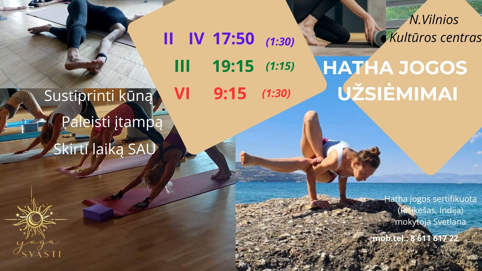 Kviečiame į Hatha jogos užsiėmimus su sertifikuota mokytoja Svetlana (mokymus baigusi Ričikešoje, Indijoje). Užsiėmimai skirti tiems, kurie nori sustiprinti kūną, palengvinti įtampą ir skirti laiką sau. Kiekvienas užsiėmimas apima įvairias jogos pozas, kvėpavimo technikas ir meditaciją, siekiant harmoningai lavinti kūną ir protą.