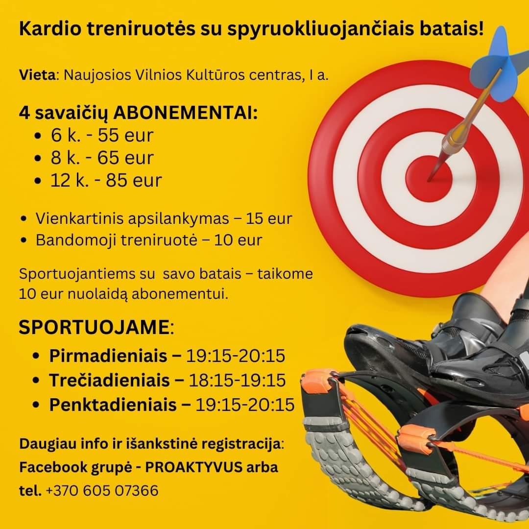 Atraskite naują būdą stiprinti savo kūną ir gerinti ištvermę su kardio treniruotėmis su spyruokliuojančiais batais! Šios treniruotės vyksta patogioje ir erdvioje Naujosios Vilnios kultūros centre, kur Jūsų laukia dinamiškas ir efektyvus užsiėmimas, skirtas įvairaus amžiaus ir fizinio pasirengimo žmonėms. Spyruokliuojantys batai ne tik sumažina sąnarių apkrovą, bet ir padeda sukurti linksmesnę bei motyvuojančią treniruočių atmosferą. Šios treniruotės apima greitą judėjimą, šuolius ir kitas veiklas, kurios puikiai tinka tiek pradedantiesiems, tiek pažengusiems. Prisijunkite prie mūsų ir pasinerkite į energingas kardio treniruotes, kurios padės ne tik numesti svorio, bet ir stiprinti širdį, gerinti fizinę būklę bei suteiks jums gaivumo ir energijos visai dienai!