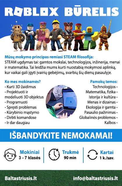 BŪRELIS NEMOKAMAS (su NVŠ krepšeliu)!!! Jeigu turite klausimų, prašome rašyti el. paštu: [email protected] Daugiau informacijos - www.baltastriusis.lt/roblox P.s. Asmens duomenų apsaugos politika. Jūsų asmens duomenys bus naudojami tik organizaciniais bei komunikavimo tikslais.