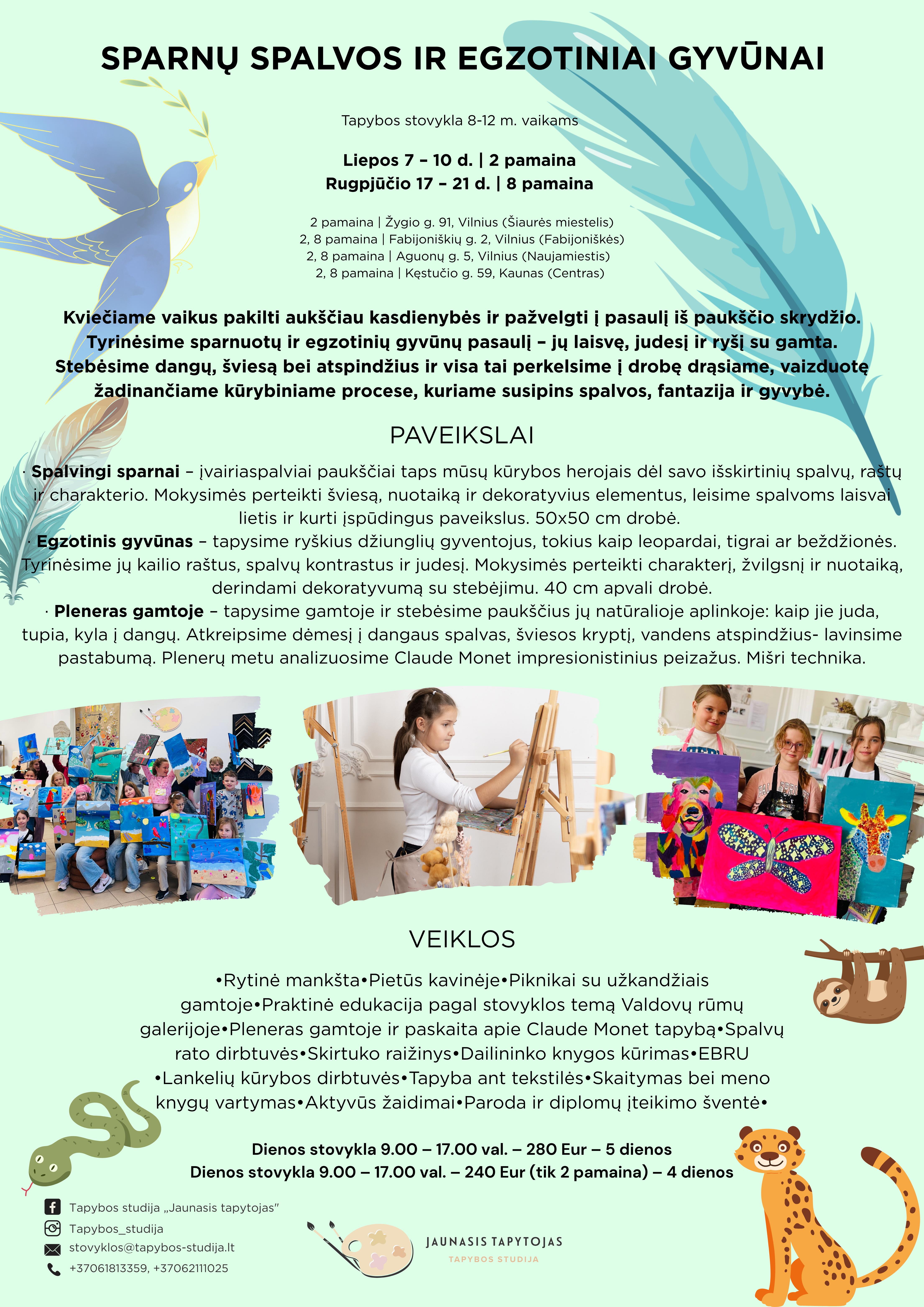 🕊️ SPARNŲ SPALVOS 🕊️ Vasaros kūrybinė dienos stovykla vaikams Vilniuje ir Kaune Kviesime vaikus pakilti aukščiau kasdienybės ir pažvelgti į pasaulį iš paukščio skrydžio. ✨ Tyrinėsime sparnuotų ir egzotinių gyvūnų pasaulį – jų laisvę, judesį ir ryšį su gamta. 🐦🌿 Stebėsime dangų, šviesą bei vandens atspindžius ir visa tai perkelsime į drobę drąsiame, vaizduotę žadinančiame kūrybiniame procese. 🎨 Čia susipins spalvos, fantazija ir gyvybė – kiekvienas darbas taps skrydžio istorija. 🌈 🎨 KĄ KURSIME: 🦜 Spalvingi sparnai Įvairiaspalviai paukščiai taps mūsų kūrybos herojais dėl savo išskirtinių spalvų, raštų ir charakterio. Mokysimės perteikti šviesą, nuotaiką ir dekoratyvius elementus, leisime spalvoms laisvai lietis ir kurti įspūdingus paveikslus. 50×50 cm drobė 🪶 Plunksna Kiekviena plunksna pasakoja istoriją apie skrydį ir keliones. Iš arti tapysime plunksną, gilinsimės į jos tekstūrą ir spalvų perėjimus. Naudosime smulkius teptukus, o foną papuošime tikromis plunksnomis. 40 cm apvali drobė 🐆 Egzotinis gyvūnas Tapysime ryškius džiunglių gyventojus – leopardus, tigrus ar beždžiones. Tyrinėsime jų kailio raštus, spalvų kontrastus ir judesį, mokysimės perteikti charakterį, žvilgsnį ir nuotaiką. 40 cm apvali drobė 🌿 Pleneras gamtoje – sparnų įkvėptas peizažas Tapysime gamtoje ir stebėsime paukščius jų natūralioje aplinkoje. Atkreipsime dėmesį į dangaus spalvas, šviesos kryptį ir vandens atspindžius – lavinsime pastabumą. Įkvėpimo semsimės iš Claude Monet impresionistinių peizažų. Mišri technika ✨ VEIKLOS: Rytinė mankšta Pietūs kavinėje Piknikai gamtoje Edukacija Valdovų rūmų galerijoje Pleneras ir paskaita apie Claude Monet Spalvų rato dirbtuvės Skirtuko raižinys Dailininko knygos kūrimas visos savaitės metu EBRU tapyba ant vandens Eskizavimas lauke Lankelių kūrybos dirbtuvės Tapyba ant tekstilės Meno knygų skaitymas ir vartymas Aktyvūs žaidimai 🎉 SAVAITĖS PABAIGOJE: Paroda ir diplomų įteikimo šventė 📍 VIETOS: Kęstučio g. 59, Kaunas Žygio g. 91, Vilnius Fabijoniškių g. 2, Vilnius Bitėnų g. 1C, Vilnius Aguonų g. 5, Vilnius 💰 KAINA: 2 pamaina (4 dienos) – 240 Eur Galimas ankstyvas atvykimas – 20 Eur savaitei. Būtina informuoti iš anksto. 📩 REGISTRACIJA: [email protected] +370 618 13 359 +370 621 11025